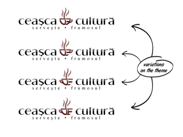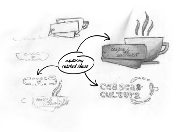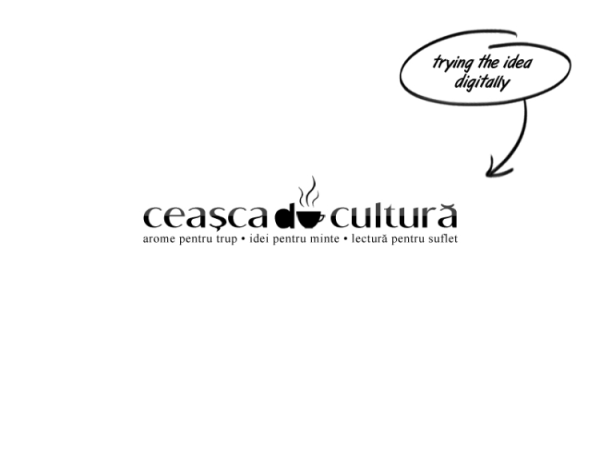 Găsirea unei idei de urmat nu a fost atât de ușoară, întrucât trebuia să fie simplă, însă eficace. Am schițat multe foi până să mă apropii cât de cât de ceva decent. Practic, trebuia ca în centrul acelui tot să se afle cultura, iar logotipul trebuia să fie conținut într-o ceașcă poziționată central.