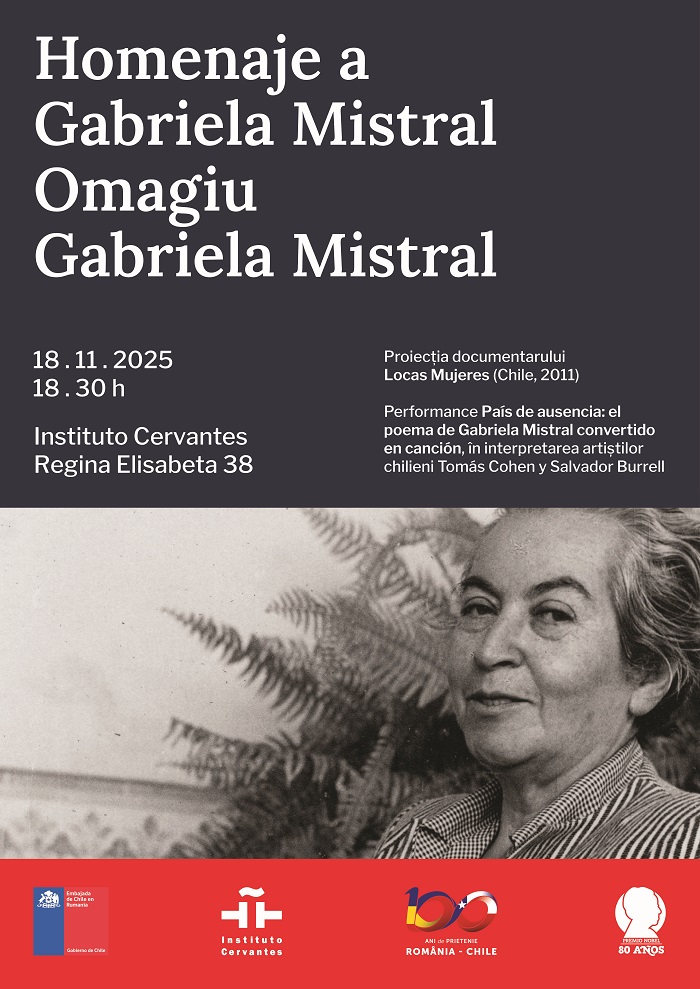 Cu ocazia aniversării a 80 de ani de la acordarea Premiului Nobel pentru Literatură renumitei poete, diplomate și educatoare chiliene Gabriela Mistral și a centenarului relațiilor diplomatice dintre România și Chile, Ambasada Chile în România, în colaborare cu Institutul Cervantes din București, organizează „Omagiu Gabriela Mistral”, care va avea loc pe 18 noiembrie, ora 18.30, la sediul Institutului Cervantes din București (Bd. Regina Elisabeta, nr. 38).