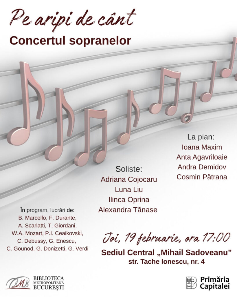 Biblioteca Metropolitană București organizează joi, 19 februarie, de la ora 17.00, recitalul Pe aripi de cânt – Concertul sopranelor, la Sediul Central Mihail Sadoveanu, din strada Tache Ionescu nr. 4.