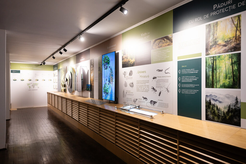 Expoziția cuprinde diorame dedicate zimbrului și importanței „lemnului mort” în ecosistem, o proiecție imersivă care acoperă 70 m², precum și instalații high tech, printre care ochelari VR ce oferă posibilitatea de a privi natura din perspectiva unor specii reprezentative ale parcului. De asemenea, există spații special amenajate care prezintă atât evoluția zonei din ultimii 8.000 de ani, cât și elemente semnificative ale patrimoniului cultural și spiritual specifice comunităților locale.