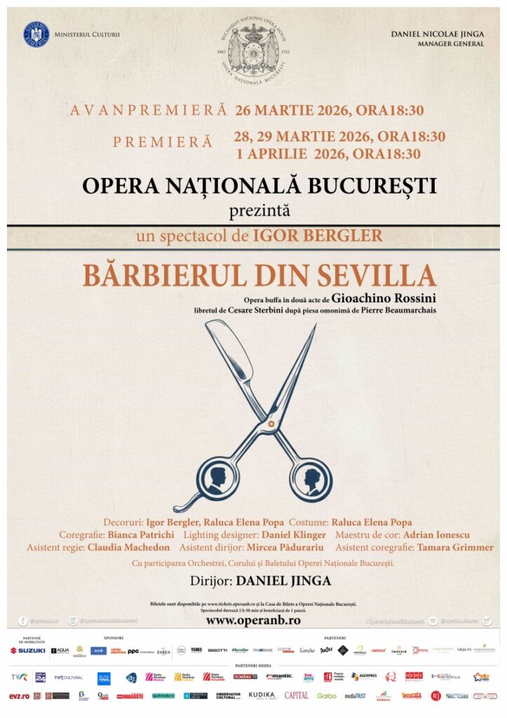 Opera Națională București prezintă premiera spectacolului „Bărbierul din Sevilla” de Gioachino Rossini, într-o montare în regia lui Igor Bergler, decorurile poartă semnăturile lui Igor Bergler și a  Ralucăi Popa, costumele au fost create de Raluca Popa, coregrafia îi aparține Biancăi Patrichi, luminile Daniel Klinger, iar conducerea muzicală va fi asigurată de maestrul Daniel Jinga. Reprezentațiile se vor desfășura în serile de joi, 26 martie (avanpremieră), sâmbătă, 28 martie duminică, 29 martie, și miercuri, 1 aprilie, cu titlu de premieră, începând cu ora 18:30, cu participarea Orchestrei, Corului și Baletului Operei Naționale București, maestru de cor Adrian Ionescu, asistent regie Claudia Machedon, asistent dirijor Mircea Pădurariu.