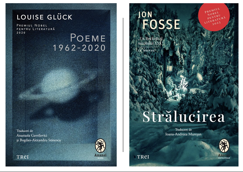 Editura Trei a publicat recent noi traduceri în premieră din operele poetei americane Louise Glück și ale scriitorului norvegian Jon Fosse, laureați ai Premiului Nobel pentru Literatură, în 2020, respectiv 2023. Este vorba despre integrala poeziei lui Louise Glück, reunită în volumul Poeme. 1962-2020, și de ediția în limba română a romanului Strălucirea de Jon Fosse, ambele publicate în traducere în cadrul imprintului Anansi. World Fiction.