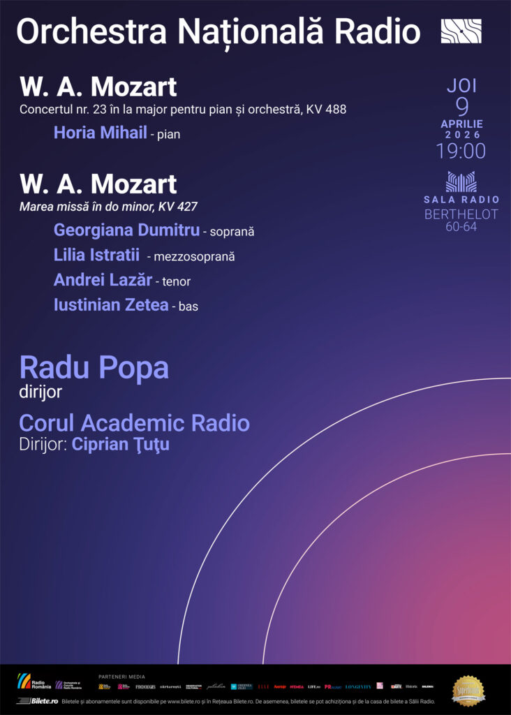 În așteptarea Paștelui, în Joia Mare (9 aprilie 2026 – de la 19.00), Orchestra Națională Radio, sub bagheta dirijorului Radu Popa, ne invită la o seară specială, un eveniment 100% Mozart în care muzica va răsuna la Sala Radio ca într-o catedrală. Vom asculta celebra lucrare semnată de Amadeus: Marea missă în do minor, una dintre cele mai impresionante și enigmatice creații sacre ale compozitorului, o partitură monumentală, profund dramatică și, paradoxal, neterminată.