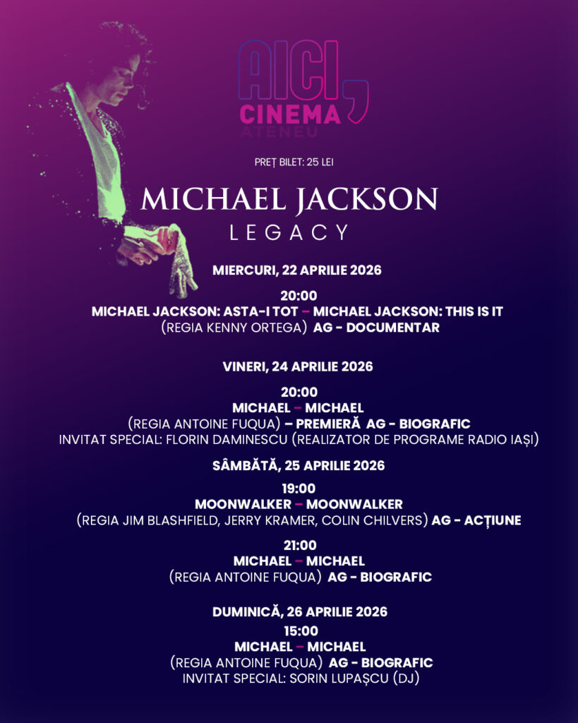 Cinema Ateneu invită publicul ieșean să celebreze viața, muzica și geniul artistic al unuia dintre cei mai mari entertaineri ai tuturor timpurilor, în cadrul programului special Michael Jackson: Legacy. Evenimentele vor avea loc în Sala Mare de Spectacole „Radu Beligan” a Ateneului Național din Iași și vor aduce pe marele ecran trei producții de excepție, inclusiv mult-așteptata premieră a filmului biografic Michael (regia Antoine Fuqua), un proiect special în care rolul legendarului artist este interpretat chiar de nepotul său – Jaafar Jackson, aducând pe ecran o interpretare profund personală și autentică.