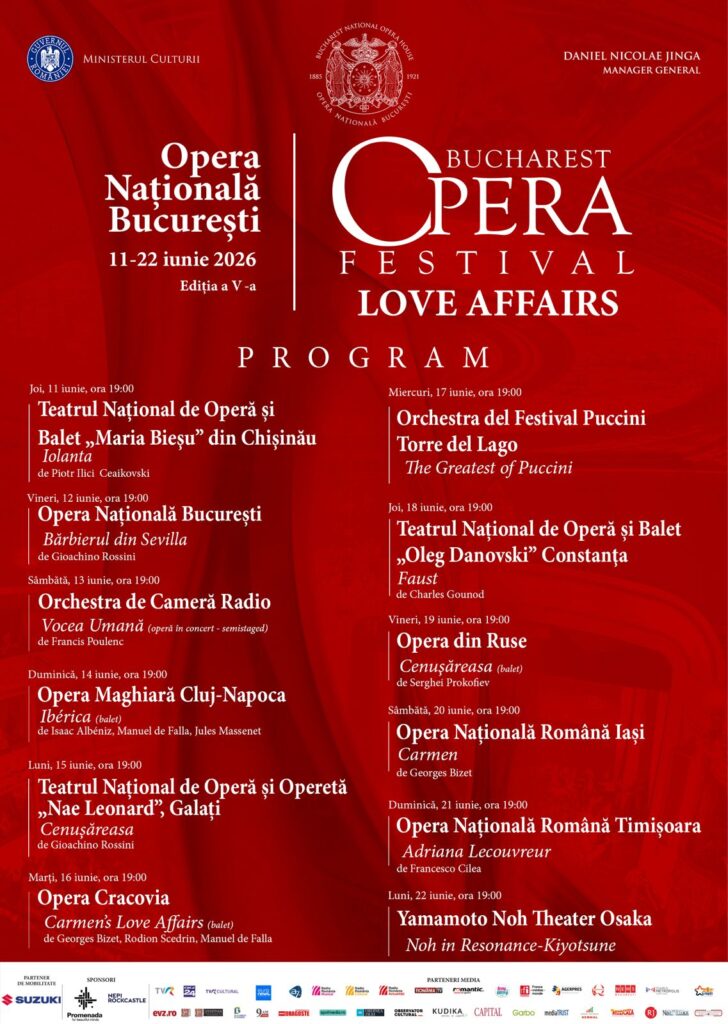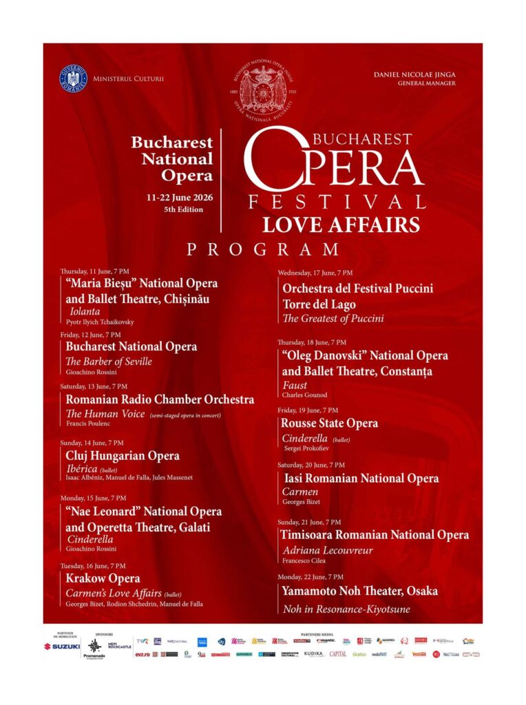 Între 11 și 22 iunie, scena Operei Naționale București devine spațiul marilor povești de iubire: tragice, pasionale, imposibile sau salvatoare. A cincea ediție a Bucharest Opera Festival aduce 12 seri consecutive de operă, balet și teatru muzical, în care marile „love affairs”capătă expresii artistice spectaculoase, prin producții semnate de companii din România și din întreaga lume.