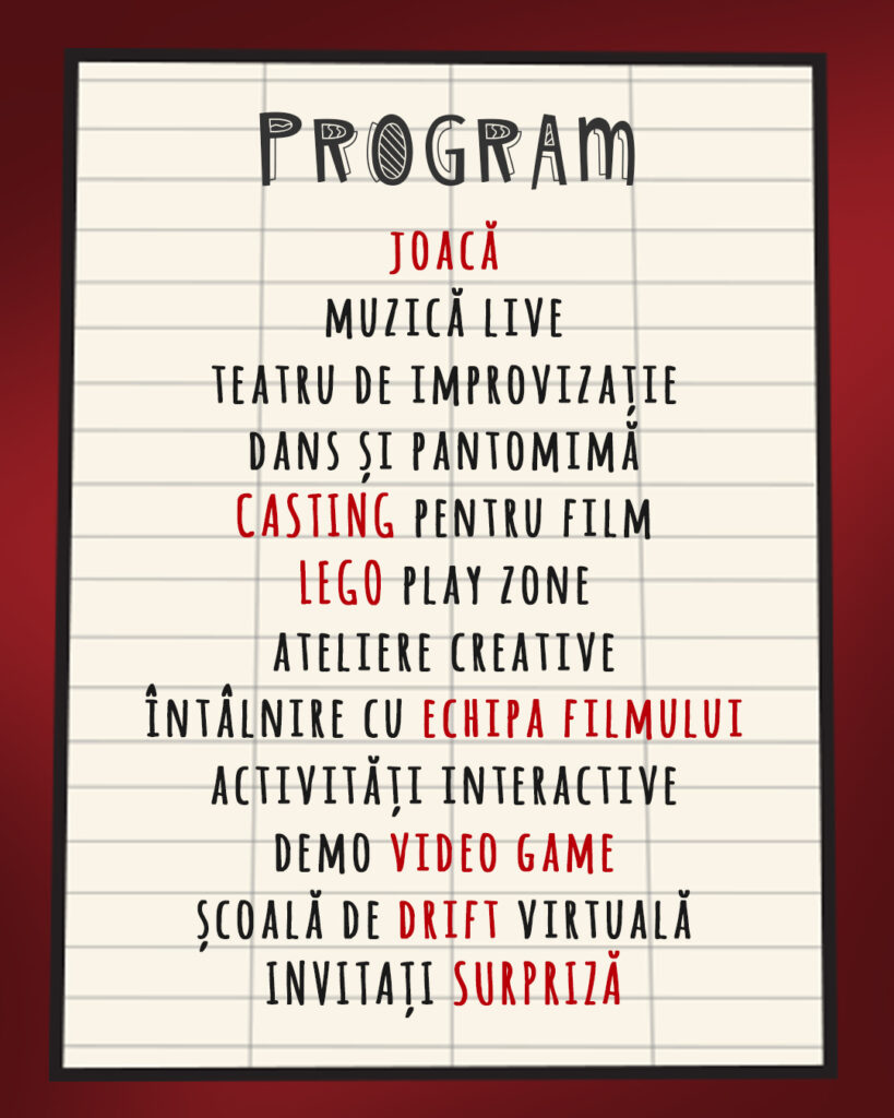 Evenimentul, organizat sub forma unui mini-festival de opt ore de joacă și bucurie, include, pe lângă accesul special la înscrieri pentru casting,  numeroase momente artistice, muzică live, teatru de improvizație pentru copii, dans, ateliere pentru copii de diferite vârste (LEGO play zone powered by Brickdepot, ateliere creative, gaming area powered by Asus & activări interactive), o expoziție de afișe de filme pentru copii.